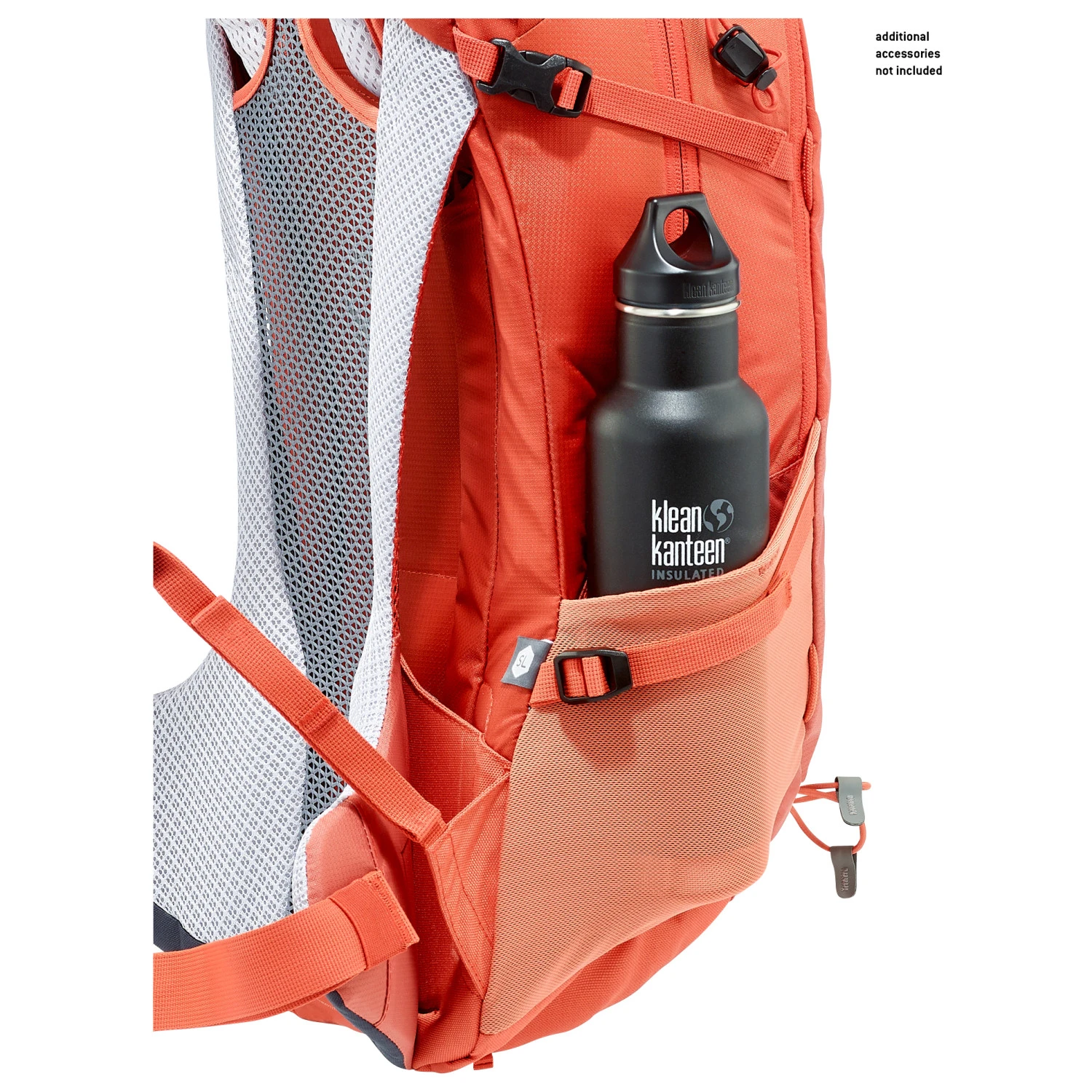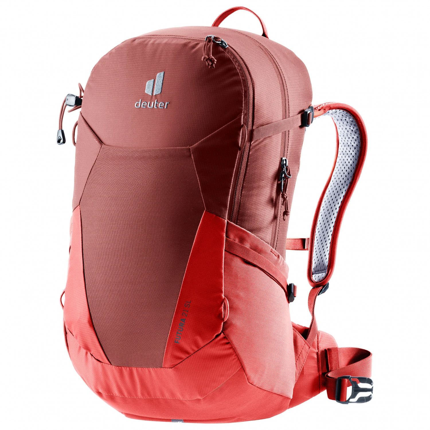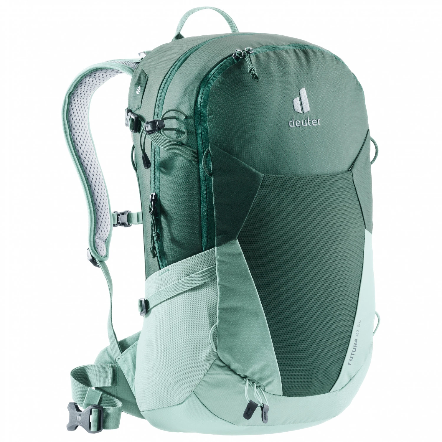 Der Women’s Futura 21 SL Wanderrucksack von Deuter sieht schon auf den ersten Blick nach einem echten Profi in Sachen Wanderungen aus. Durch das toll belüftete Rückenteil ist ein unangenehmes Tragen bei schweißtreibenden Bedingungen ausgeschlossen. Zudem sitzen die weichen Schulter- und Hüftträger angenehm am Körper und lassen sich perfekt auf die individuelle Passform einstellen. Die Schulterträger sind beweglich, sodass sie auch anspruchsvolle Bewegungen mitmachen. Die vielen Fächer bieten in Kombination mit dem Organisationsteil im vorderen Bereich des Rucksacks tolle Möglichkeiten kleine Utensilien zu verstauen und diese aufgeräumt und ordentlich zu transportieren. An der Außenseite des Rucksacks lassen sich Helm und Trekkingstöcke einfach an den vorhandenen Riemen befestigen. Bei schweißtreibenden Bedingungen kommt die Kompatibilität des Rucksacks mit einer Trinkblase zum Tragen. So kann ohne anzuhalten im Gehen getrunken werden. Auch bei schlechtem Wetter hat der Futura ein Argument im Rucksack. Die abnehmbare Regenhülle schützt vor Feuchtigkeit und Nässe.