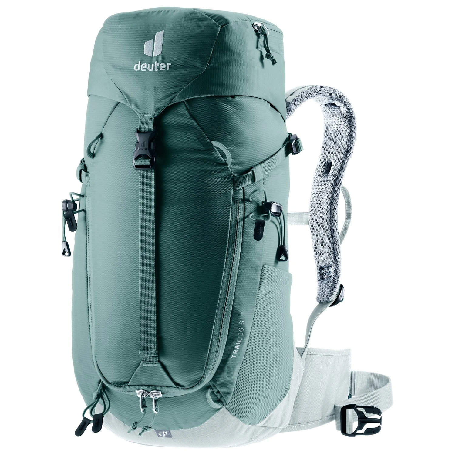 Die Hüftflossen und der Brustgurt lassen sich zum Klettern abnehmen. Deine Wanderstöcke oder der Eispickel lassen sich bequem außen am Tourenrucksack anbringen. Zwei elastische Seitentaschen bieten Dir Platz für Trinkflaschen oder Ausrüstung. Seitliche Kompressionsriemen sowie ein Wertsachenfach im Inneren lassen keine Wünsche offen. Die abnehmbare Regenhülle, ein integriertes SOS-Label sowie das abnehmbare Deckelfach machen den Deuter Women’s Trail 16 SL zum idealen Begleiter am Berg.