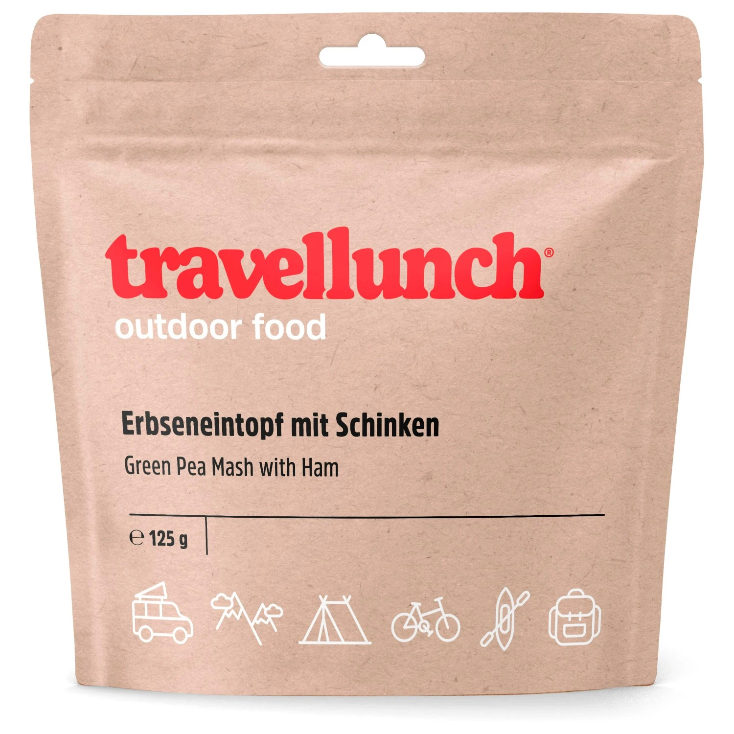 Ideal für Touren, bei denen jedes Gramm ins Gewicht fällt: Outdoor Nahrung von Travellunch, für eine ausgewogene Ernährung on Tour! Um nach anstrengenden Tagen in Bergen, Gletschern oder am Kletterfels wieder zu Kräften zu kommen, bietet Travellunch vollwertige Mahlzeiten aus gefriergetrockneten Zutaten, die durch geringes Gewicht und Volumen punkten. Neben abwechslungsreichen Hauptgerichten gibt es auch Frühstück, Desserts und Getränke. Die Gerichte sind geschlossen und ungekühlt für ca. 2 Jahre haltbar und lassen sich einfach zubereiten: angegebene Menge heißes Wasser in die Packung geben, verschließen und einige Minuten ziehen lassen (genaue Zeit ist auf der jeweiligen Verpackung angegeben) – fertig! Travellunch Erbseneintopf mit Speck gibt’s als 125 g (ergibt ca. 500 g) und 250 g (ergibt ca. 1000 g) Packung. Die große Packung ergibt zwei kleine Portionen. Bei großem Hunger oder hohem Energiebedarf sollte man aber doch eine komplette 250 g Packung pro Person rechnen! Zutaten: Erbsen (23%), Kartoffeln, Fett pflanzlich gehärtet, Schinken (9%), Röstzwiebeln, pflanzliches Eiweiß, Kartoffelstärke, Vollmilchpulver, Salz, natürliche Aromen, Gewürzextrakte, Antioxidationsmittel: E304. Enthält: Soja, Sulfit.