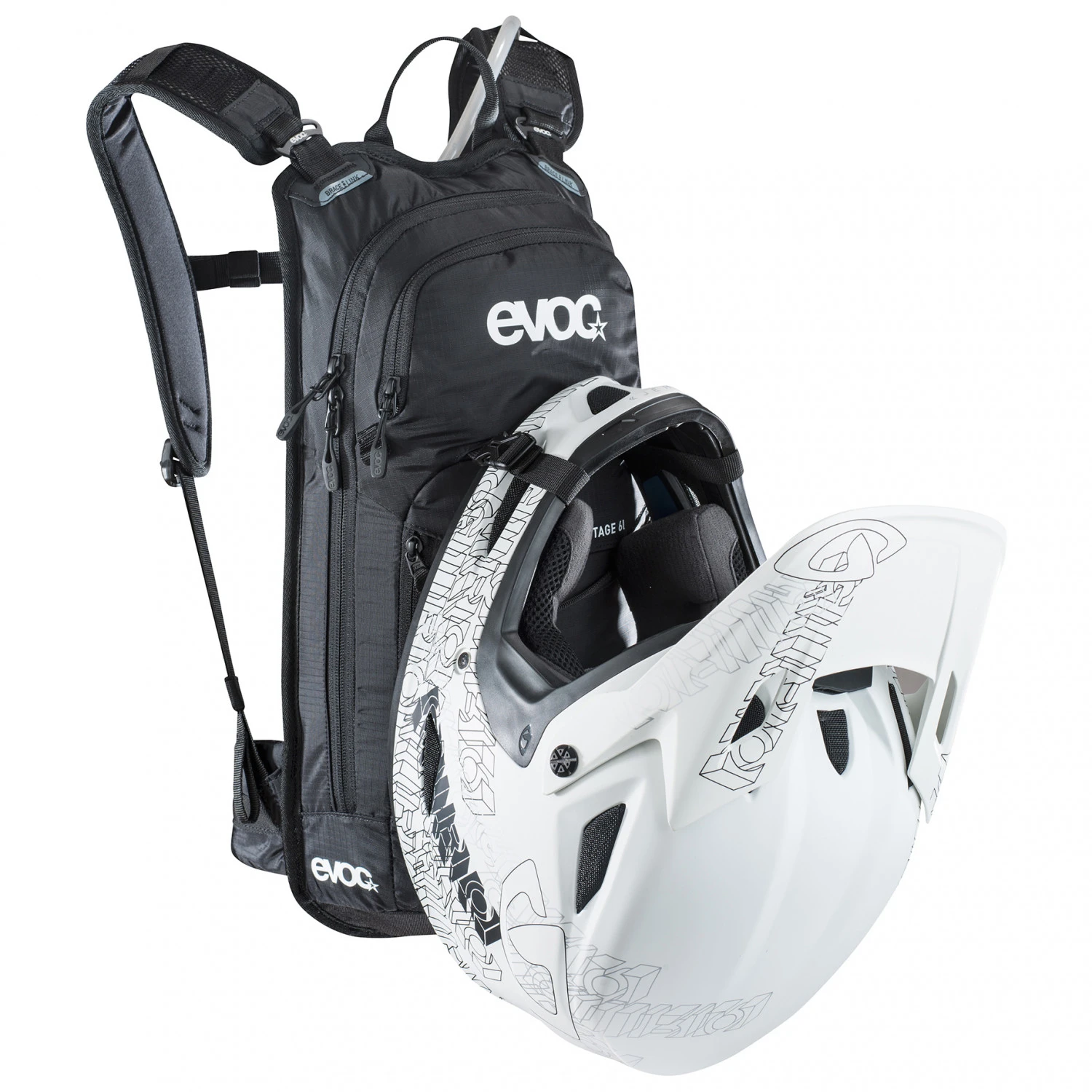 Der Stage 6 von Evoc ist ideal für kurze Enduro Ausfahrten oder Bikeparks geeignet. Aufgrund der kleinen Abmessungen stört er nicht bei technischen Abfahrten und die Brace Link Konstruktion bietet maximale Bewegungsfreiheit. Diese verbindet die Schultergurte flexibel mit dem Rucksack und sorgt für maximale Flexibilität. Das Rückensystem ist atmungsaktiv konstruiert und sorgt auch bergauf für eine gute Belüftung. In den Fächern können Werkzeug und Snacks verstaut werden und das Rückenfach bietet zudem Platz für ein Trinksystem. Eine Signalpfeife und Helmhalterung gehören ebenso mit zur Ausstattung. Diese ermöglicht das Befestigen von XC- und DH-Helmen.