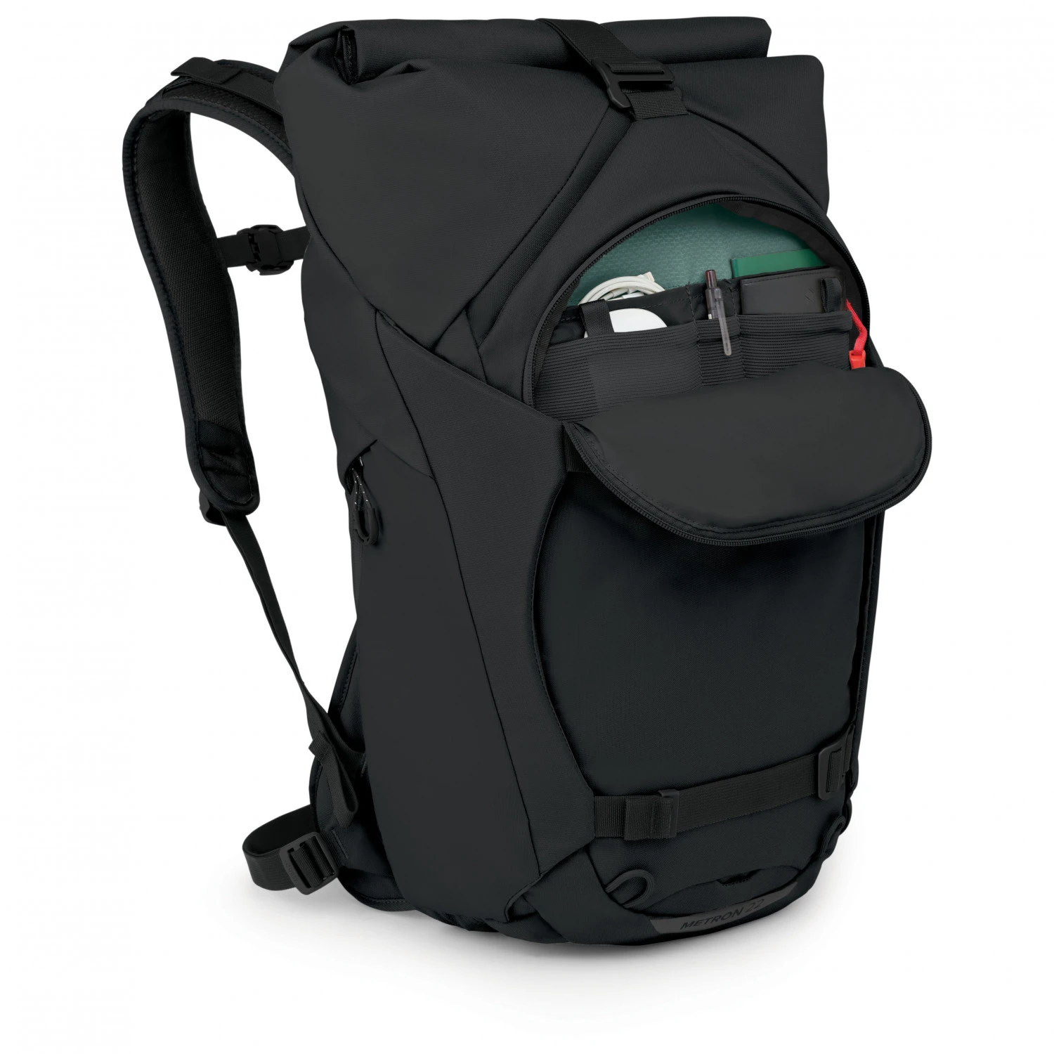 Punktet mit ordentlich Stauraum und einem kompakten Packmaß, der Daypack Metron 22 Roll Top von Osprey! Neben einem großen Hauptfach, wo Dein Laptop Platz hat, kommt der Rucksack mit einem kleinen Organizer-Fach und externen Flaschenfächern daher. So hast Du einen ordentlichen Überblick und alles schnell griffbereit. Das Tragesystem ist gepolstert, den Hüftgurt kannst Du bei Bedarf abnehmen. An den Riemen kannst Du zum Beispiel eine Jacke sicher befestigen. Ideal zum Pendeln mit dem Bike oder für kleine Wanderungen!