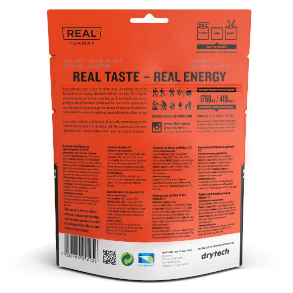 Couscous bietet definitiv eines der besten Verhältnisse auf Tour was das Nettogewicht und die Zubereitungsmenge angeht. Von Real Turmat gibt es hier vegetarisches Couscous mit Linsen und Spinat als voll vakuumisierte Trekkingnahrung. Das spart Gewicht und Platz im Rucksack, sorgt einmal fertig zubereitet jedoch für eine ordentliche Hauptmahlzeit, die schmeckt und satt macht! Zutaten: Couscous (Weizen) (32%), Linsen (12%), Sojafleisch (Soja (98%), Salz, Chili) (12%), Karotte, Sahne (Milch), Zwiebeln, grüne Bohnen, Blumenkohl, Maisstärke, Rapsöl, Spinat (2,7%), Sellerie, Sojasoße, Gemüsebouillon (Soja), Knoblauch, Gewürze, Antioxidantien (Ascorbinsäure).