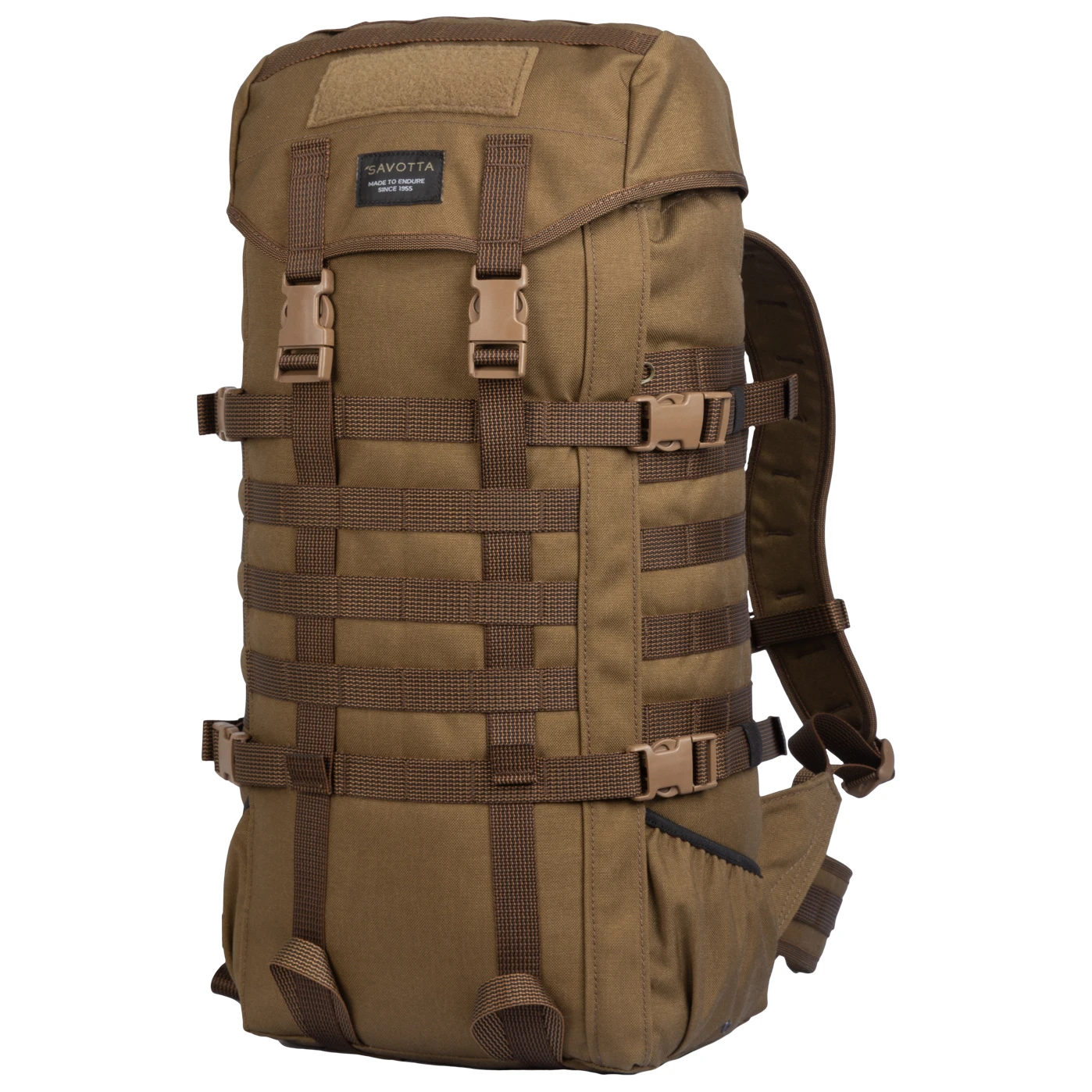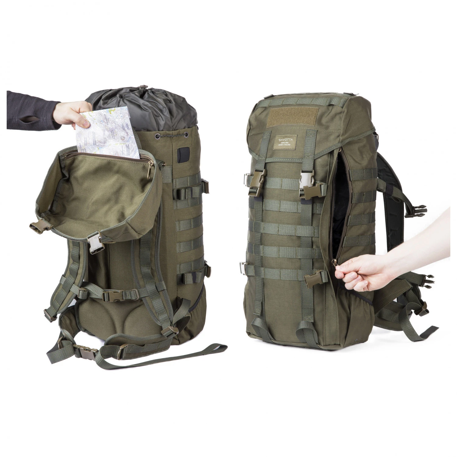 Bewährter Partner für wahre Outdoorfreaks: der Jääkäri M 30 Wanderrucksack von Savotta! Dieses extrem robuste Multitalent ist auf die hohen Ansprüche von Jägern und Grenzschützern ausgelegt und wird auch den normalen Wildnisfan begeistern. Mit seinem reißfesten und abriebbeständigen Corduragewebe und dem schlanken Design kommt er auch im dichten Unterholz gut voran. Durch die seitlichen Kompressionsriemen kann die Ladung dabei eng an den Rücken gebracht werden. Auch bei Dauerregen gibt es keine Probleme, denn der komplette Rucksack ist von innen wasserdicht beschichtet. Bei Touren im offenen Gelände kann man dank des Molle Webbing-Systems diverse Ausrüstungsgegenstände und optionale Taschen anbringen und so das Volumen des Rucksacks deutlich erweitern.