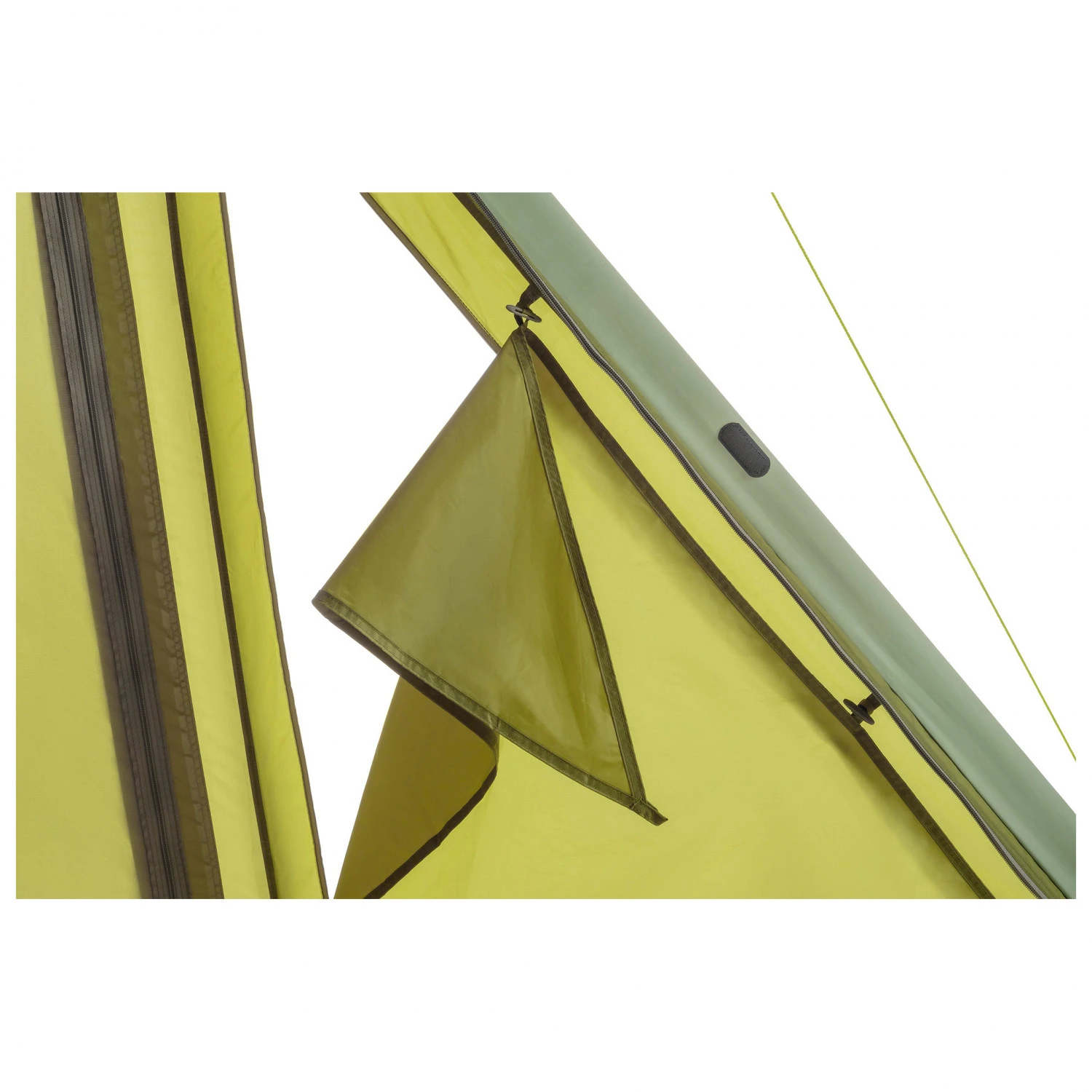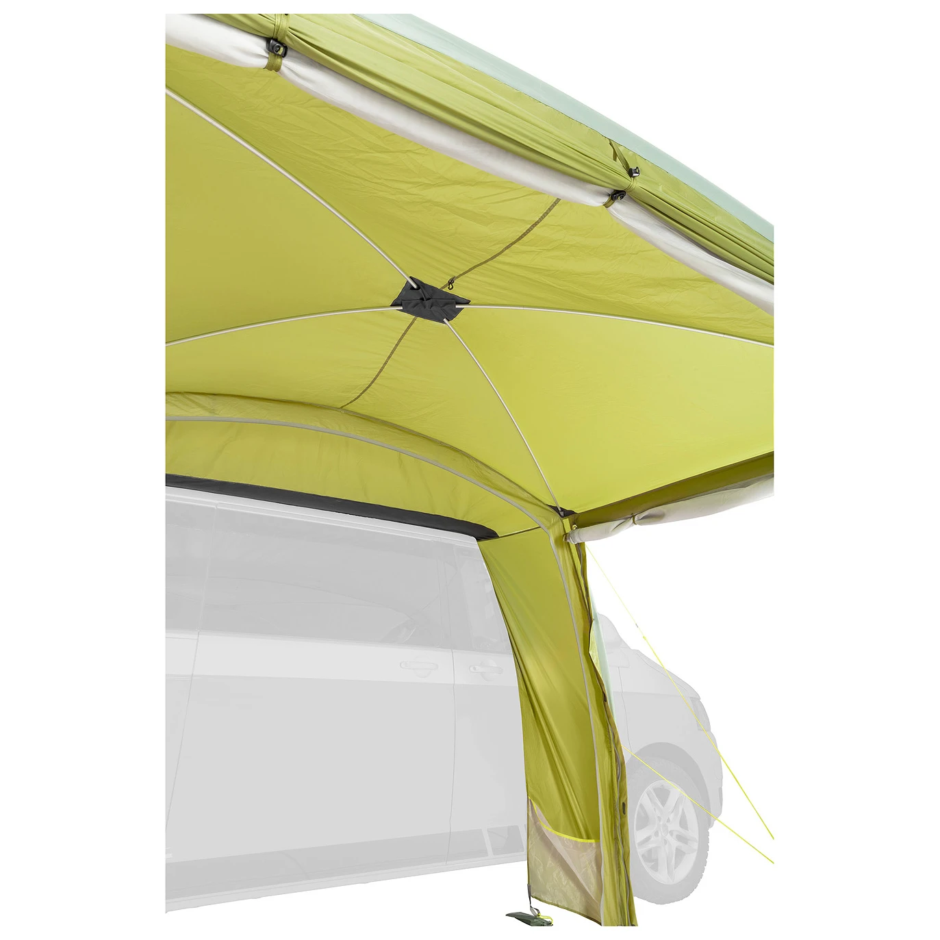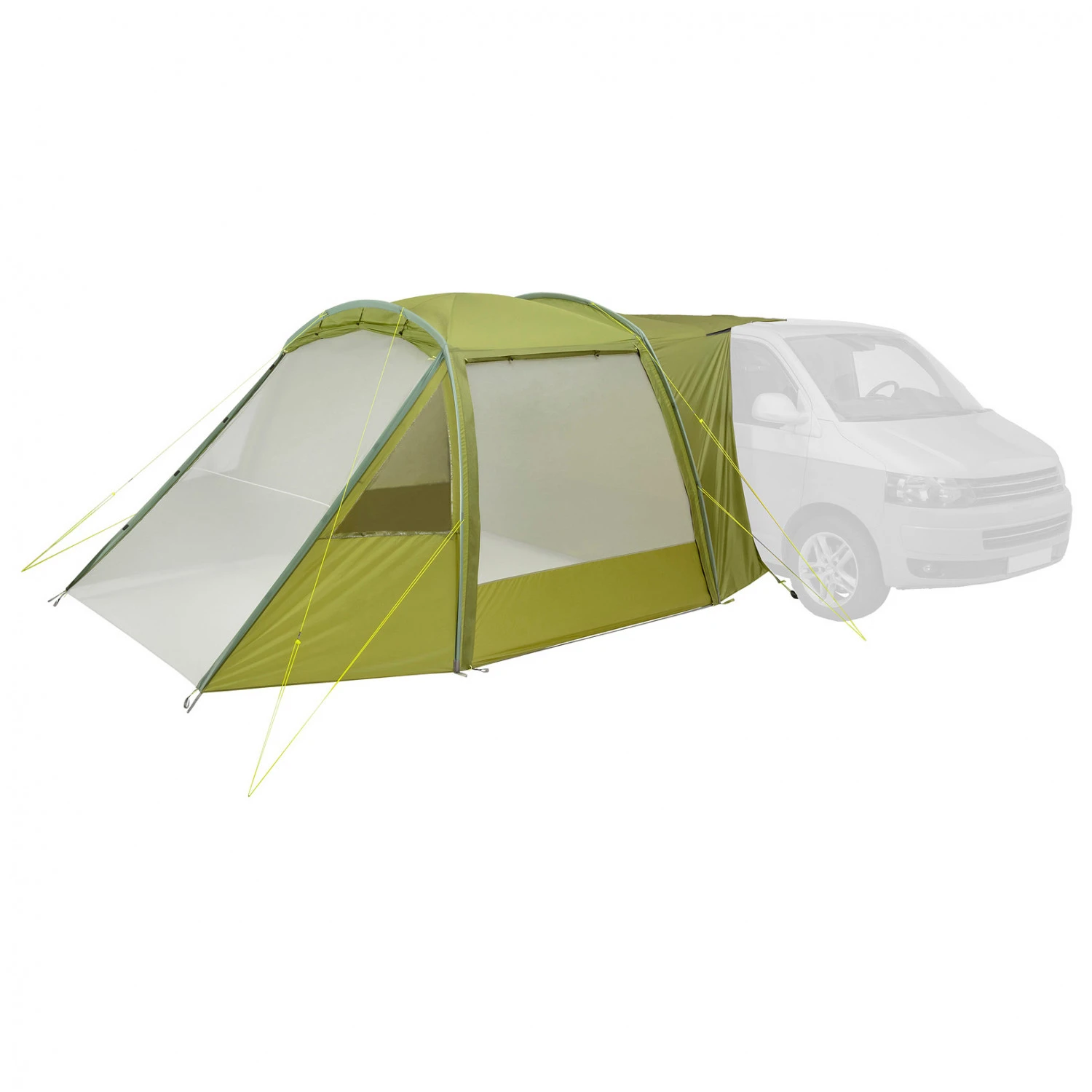 Stehhohes Vorzelt mit Tunnelkonstruktion und Zugängen von drei Seiten zum Anbau an Camping-Busse verschiedener Marken. Das Van Camp von Tatonka wird mit zwei Gestängebögen aufgespannt und mit einem Keder-Adapter in die Kederschiene des Busses eingezogen. Die Kederbefestigung lässt sich vom aufgestellten Zelt abzippen, sodass es auch alleine stehen kann. Das Van Camp besitzt einen Frontzugang mit Doppelreißverschluss sowie Zugänge von beiden Seiten. Alle drei Seiten lassen sich hochrollen, als Sonnendach aufspannen und mit separatem Moskitonetz verschließen. Zwei Fenster im Vorzelt sorgen für gute Lichtverhältnisse, wenn das Zelt komplett geschlossen ist. Der in der Rückwand befindliche Eingang in den Bus kann ebenfalls per Reißverschluss verschlossen werden.